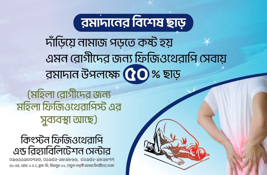 কিংস্টন ফিজিওথেরাপি এন্ড রিহ্যাবিলিটেশন সেন্টারে রমাদান মাসব্যাপী দাঁড়িয়ে নামাজ পড়তে কষ্ট হয় এমন রোগীদের জন্য বিশেষ অফারে ফিজিওথেরাপি চিকিৎসার ব্যবস্থা করা হয়েছে। যেখানে বিশেষজ্ঞ কনসালটেন্টের পরামর্শ সম্পূন্ন ফ্রি ও ফিজিওথেরাপি চিকিৎসায় ৫০% ছাড়ে প্রতিদিন সকাল ৯ টা থেকে রাত ১০ টাকা পর্যন্ত চিকিৎসা নেওয়ার সুযোগ রয়েছে।