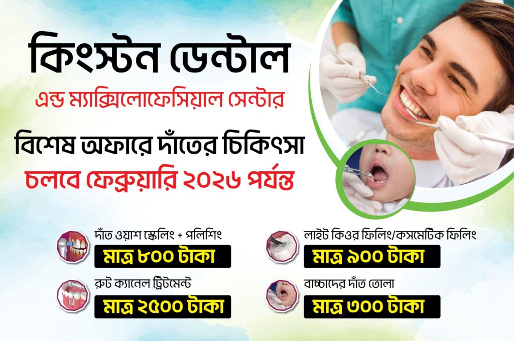 আপনার ও আপনার পরিবারের সুন্দর ও সুস্থ হাসির জন্য কিংস্টন হাসপাতাল নিয়ে এসেছে সীমিত সময়ের বিশেষ ডেন্টাল অফার। আধুনিক যন্ত্রপাতি, অভিজ্ঞ ডেন্টাল সার্জন এবং স্বাস্থ্যসম্মত পরিবেশে আমরা দিচ্ছি মানসম্মত দাঁতের চিকিৎসা—সাশ্রয়ী মূল্যে।