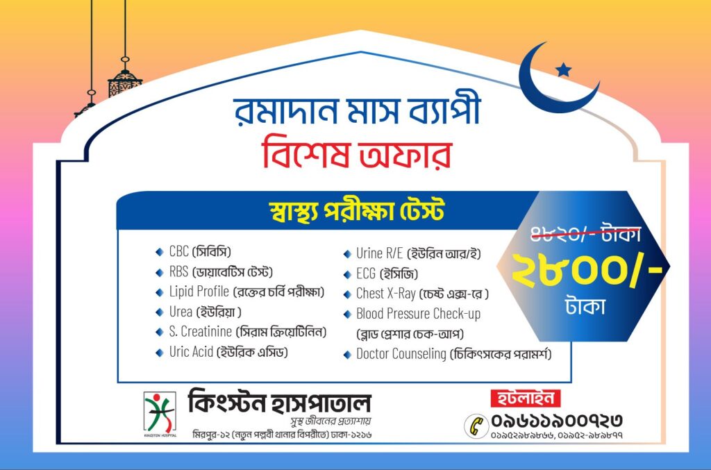 এই বিষয়টি মাথায় রেখে কিংস্টন হাসপাতাল নিয়ে এসেছে রমাদান মাসব্যাপী বিশেষ স্বাস্থ্য পরীক্ষা টেস্ট প্যাকেজ—যা মানসম্মত, সাশ্রয়ী এবং নির্ভরযোগ্য।