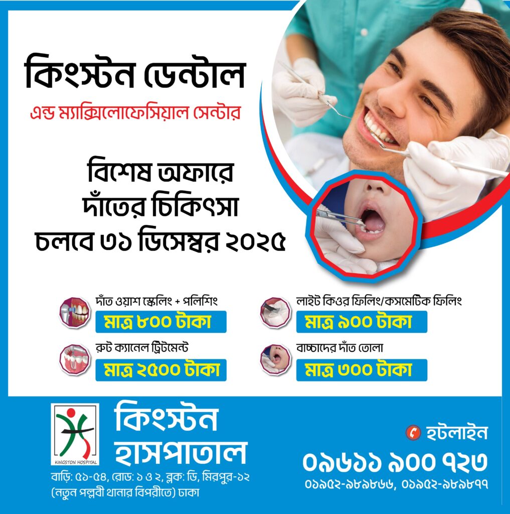 কিংস্টন ডেন্টাল অ্যান্ড ম্যাক্সিলোফেসিয়াল সেন্টার বিশেষ অফারে দাঁতের চিকিৎসা আপনার ও আপনার পরিবারের সুন্দর ও সুস্থ হাসির জন্য কিংস্টন হাসপাতাল নিয়ে এসেছে সীমিত সময়ের বিশেষ ডেন্টাল অফার। আধুনিক যন্ত্রপাতি, অভিজ্ঞ ডেন্টাল সার্জন এবং স্বাস্থ্যসম্মত পরিবেশে আমরা দিচ্ছি মানসম্মত দাঁতের চিকিৎসা—সাশ্রয়ী মূল্যে। অফার চলবে: ৩১ ডিসেম্বর ২০২৫ পর্যন্ত 🔹 আমাদের বিশেষ অফারসমূহ: 🦷 দাঁত ওয়াশিং (স্কেলিং) […]