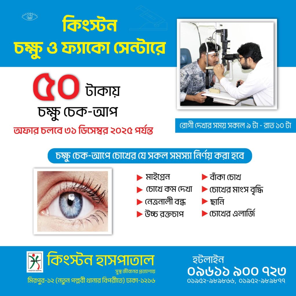 কিংস্টন চক্ষু ও ফ্যাঁকো সেন্টারের বিশেষ অফার মাত্র ৫০ টাকায় চক্ষু চেক-আপ – চলবে ৩১ ডিসেম্বর ২০২৫ পর্যন্ত