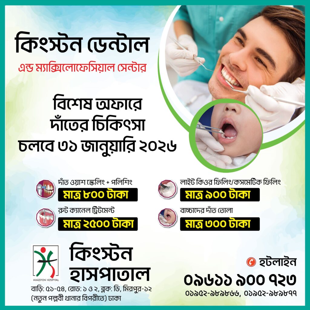 কিংস্টন ডেন্টাল অ্যান্ড ম্যাক্সিলোফেসিয়াল সেন্টার বিশেষ অফারে দাঁতের চিকিৎসা আপনার ও আপনার পরিবারের সুন্দর ও সুস্থ হাসির জন্য কিংস্টন হাসপাতাল নিয়ে এসেছে সীমিত সময়ের বিশেষ ডেন্টাল অফার। আধুনিক যন্ত্রপাতি, অভিজ্ঞ ডেন্টাল সার্জন এবং স্বাস্থ্যসম্মত পরিবেশে আমরা দিচ্ছি মানসম্মত দাঁতের চিকিৎসা—সাশ্রয়ী মূল্যে। অফার চলবে: ৩১ জানুয়ারি ২০২৬ পর্যন্ত 🔹 আমাদের বিশেষ অফারসমূহ: 🦷 দাঁত ওয়াশিং (স্কেলিং) […]